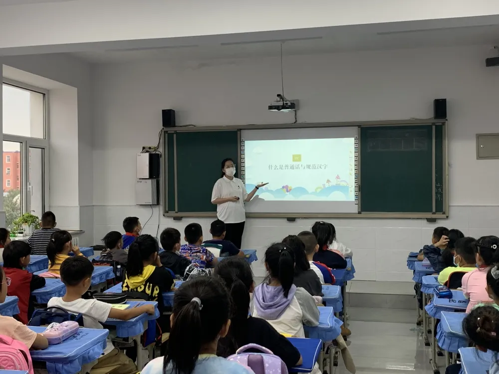 随后,实践团来到了莫力达瓦达斡尔族自治旗民族实验小学,在教务处刘老师的带领下,继续开展推普活动。成员们利用PPT演讲的方式向同学们讲述了推广普通话的目的和意义以及党史学习教育等相关内容。还通过小竞赛的方式对同学们进行普通话摸底排查、辨析错别字、和大家一起完绕口令游戏。通过队员们的普通话辅导,增强了学生们的普通话意识,让普通话在他们心中生根发芽,为学生们今后更好的发展奠定了语言基础。“斡”助家乡实践团队的大部分成员都是这所小学毕业的,因此成员们倍感亲切,和老师们也进行了亲切的交谈,在对自己的老师进行慰问以及对学校有关普通话推广工作进行了解的同时,也送去了教师节的祝福。