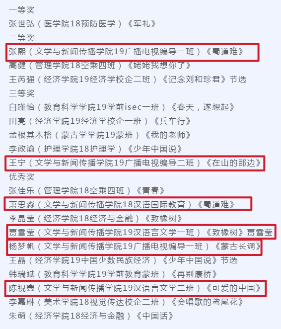 2020年内蒙古民族大学中华经典美文诵读大赛经过初赛,19组选手进入决赛,6月30日截止决赛作品提交,外聘专家评审组立即开始评审,评审组从情感、发音、声音清晰度、服装背景和作品整体效果等方面综合评审,评选出一等奖1名、二等奖3名、三等奖5名、优秀奖10名,其中我院6名学生荣获奖项。获奖名单如下: