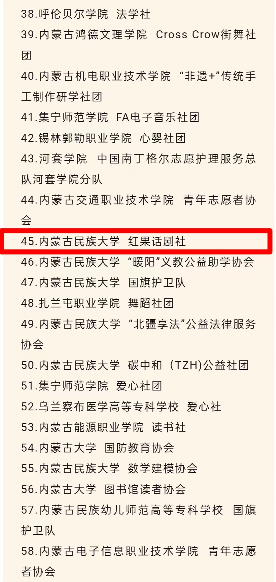 目前,经过校内选树、抖音视频展示、活动展示页点赞等环节,结合学生社团日常实际工作和建设成果,选树出一大批在学业发展、科技创新、乡村振兴、民主法治、文教体育、绿色发展、社会服务、卫国戍边、统一战线、对外交流等领域发挥育人功能突出的社团。我院红果话剧社成功入选2023-2024学年内蒙古自治区高校“活力社团”TOP100榜。