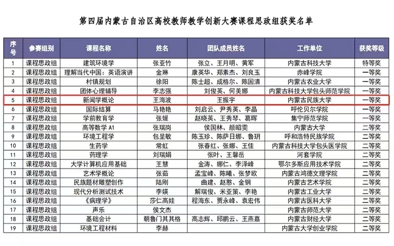 4月13日,第四届内蒙古自治区高校教师教学创新大赛在内蒙古科技大学圆满落下帷幕,我院教师王海波在本次比赛中获得课程思政组一等奖。