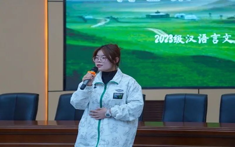 内蒙古民族大学大学生主持团秘书长陈蔚韬为三等奖获奖者颁奖