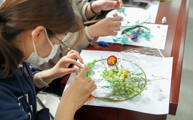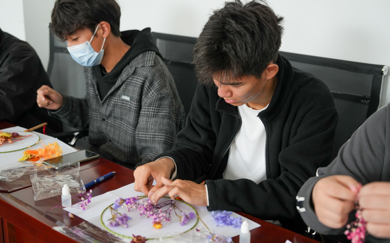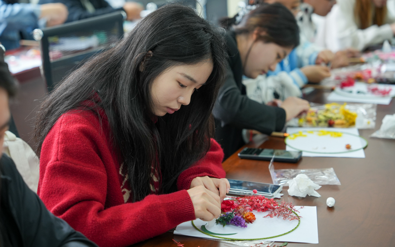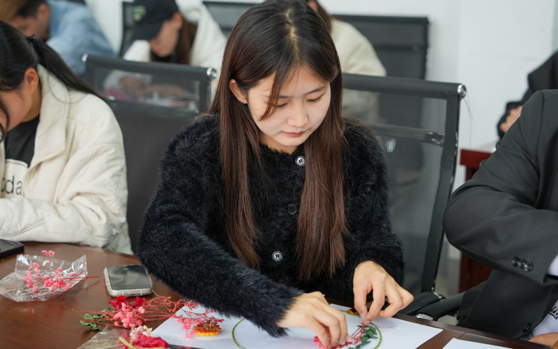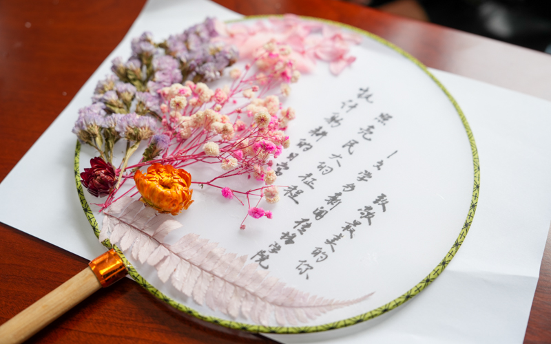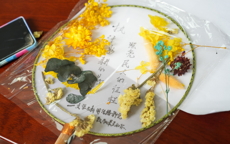 活动中,邱胜男首先说明此次沙龙活动的举办意义,并详细介绍了干花团扇的制作流程和技巧。随后,同学们兴奋地拿起手中的材料,认真选材、设计造型,从架势、布局到色彩搭配一一点缀在素白的扇面上,细细构图、精心粘贴,一朵朵干花在同学们的巧手中绽放,一面面精美的团扇逐渐成形。制作过程中,同学们不仅感受到了中国传统文化的魅力,更体会到了劳动带来的幸福与快乐。