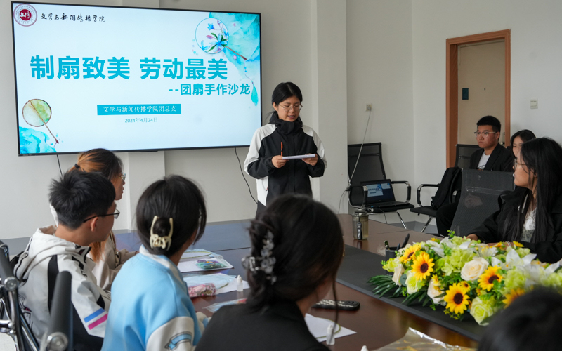 为迎接第134个“五一”国际劳动节,大力弘扬劳模精神、劳动精神、工匠精神,致敬一线最美劳动者,4月24日中午,文学与新闻传播学院于霍林河校区203室举办“制扇致美 劳动最美”团扇手作沙龙。本次沙龙共43名青马班学员参与,内蒙古民族大学书法协会2名成员协助题字,辅导员邱胜男现场指导。