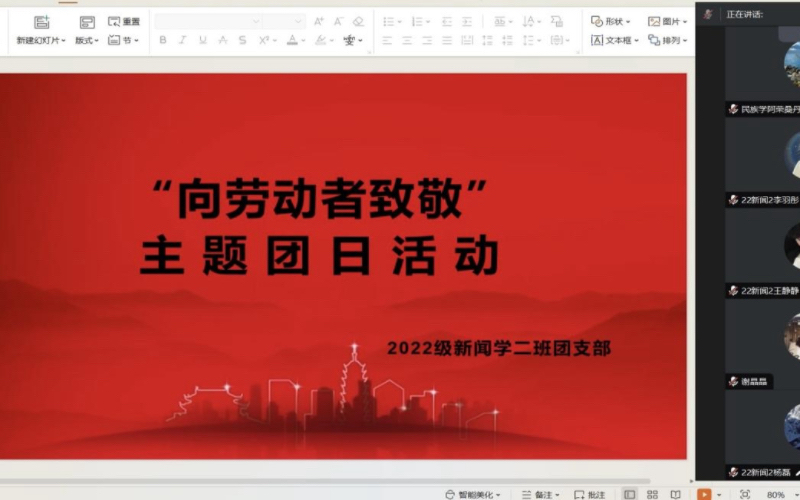为贯彻落实习近平总书记有关劳动教育的重要指示,扎实推进劳动教育开展,弘扬劳动精神和工匠精神,文学与新闻传播学院于4月28日至4月30日积极组织2022级与2023级各班团支部开展“向劳动者致敬”主题团日活动。此次团日活动以线上、线下相结合的方式开展,共15个团支部参与。