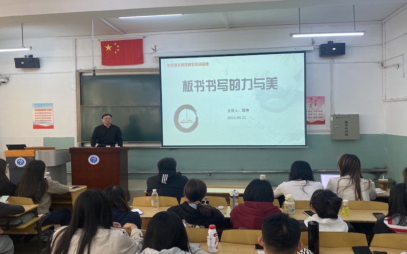 9月21日下午,文学与新闻传播学院中学语文教学实践基地联合“文苑杏坛”师范技能兴趣组在博学楼104教室开展讲座,共有50余人参加此次主题为“板书书写的力与美”的讲座,语文教育教研室主任周坤担任主讲人。