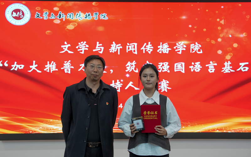 本次比赛共分为三十秒的自我介绍、一分钟的朗诵展示两部分。比赛开始后,11名参赛选手凭借澎湃激情与感染力,赢得阵阵掌声。大赛的三位评委根据选手表现进行现场打分,经现场专业评委评定,2023级汉语言文学二班周婧获得一等奖,2023级汉语言文学二班门宇婷、2023级汉语言文学二班包阿奇获得二等奖,2023级汉语言文学二班王畅想、2023级新闻学二班罗昱东、2023级新闻学二班郭俊红、2023级汉语言文学二班陈淑琪获得三等奖,2023级汉语言文学二班董经萱、2023级汉语言文学二班许佳瑶、2024级广播电视编导二班陈香雪、2024级广播电视编导二班马旭获得优秀奖。最后,赵承钢对选手们的表现予以肯定,对获奖同学表示祝贺,并从普通话发音、主持技巧、应变能力、思维逻辑、舞台台风和现场整体表现等方面作了专业点评,鼓励文传学子以自身专业为基石,积极投身推普工作。