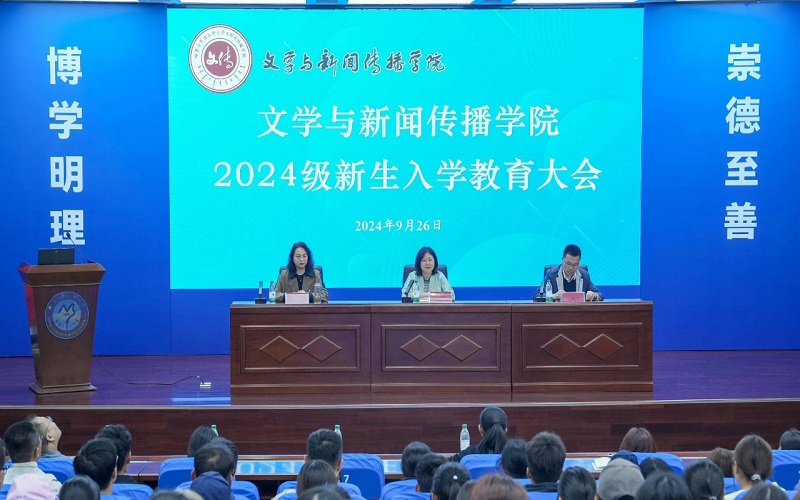 9月26日晚,文学与新闻传播学院在图书馆大报告厅召开2024级新生入学教育大会,学院院长郝青云、党委副书记包宝柱、副院长孙艳艳、学工办主任兰英、辅导员邱胜男,2024级新生班主任以及全体新生共同参加会议。会议由包宝柱主持。