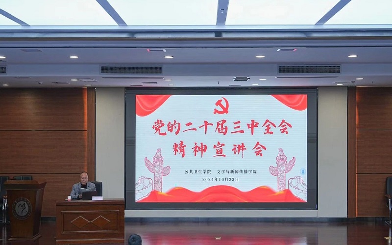 为深入学习贯彻党的二十届三中全会精神,引导广大师生把思想和行动统一到全会精神,10月23日下午,文学与新闻传播学院同公共卫生学院在图书馆小报告厅联合举办了“学习贯彻党的二十届三中全会精神”宣讲会。宣讲会邀请学校党委统战部副部长李生主讲,公共卫生学院党委书记白树全主持。文学与新闻传播学院党委副书记包宝柱、副院长孙艳艳及教职工代表、学生代表170余人参加。