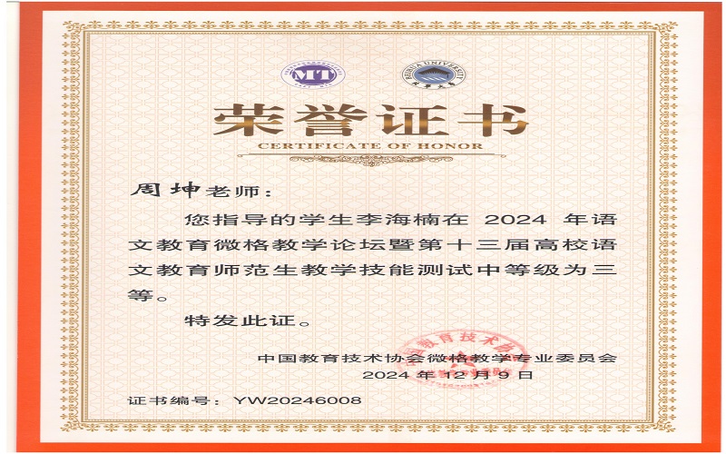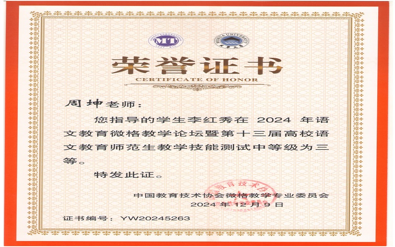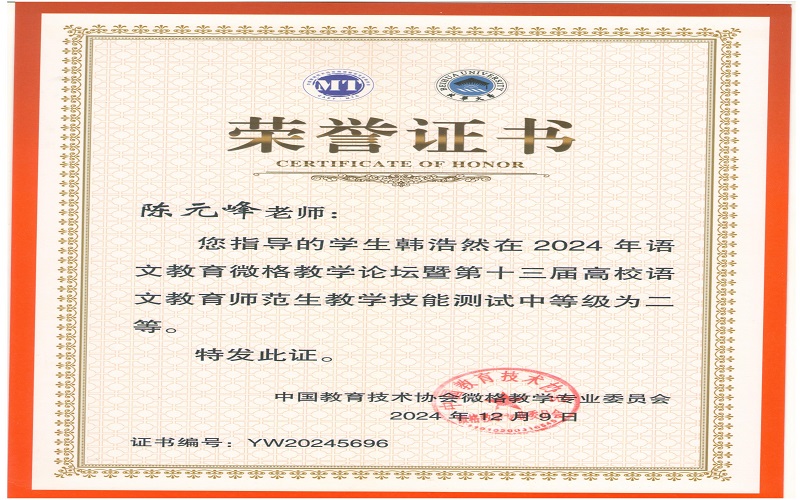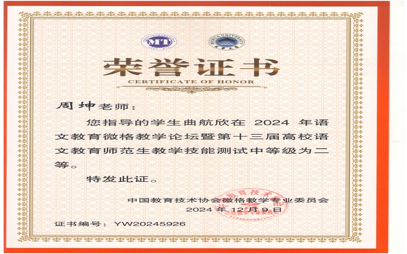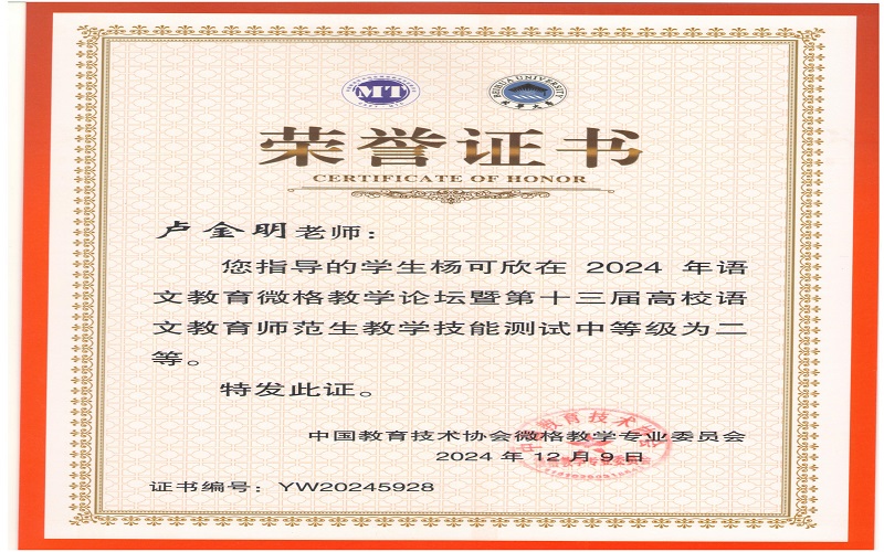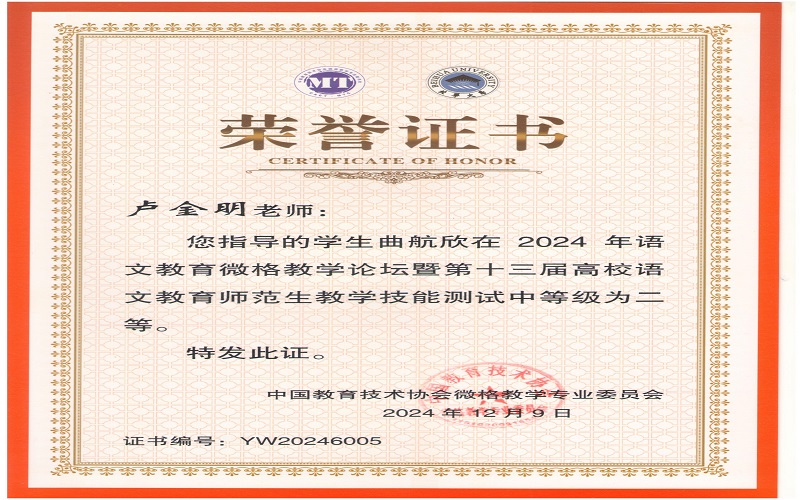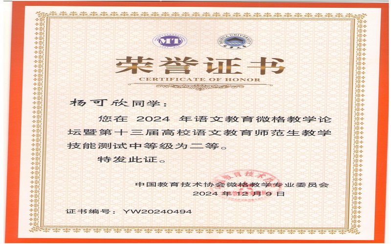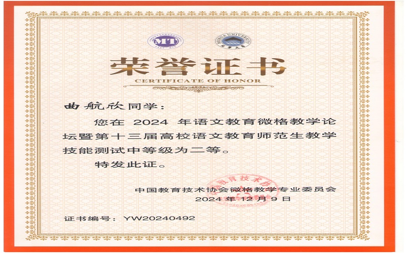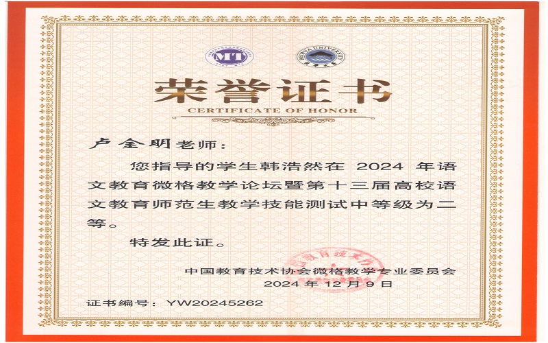 2024年12月7日,由中国教育技术协会微格教学专业委员会主办,北华大学承办的2024年语文微格教学论坛暨第十三届高校语文师范生教学技能测试与交流展示活动在吉林落下帷幕。来自全国九十多所高校500余名学生参与此次活动。文学与新闻传播学院杨可欣、曲航欣等6名同学参加了本次比赛并取得了好成绩。