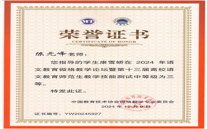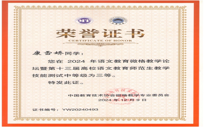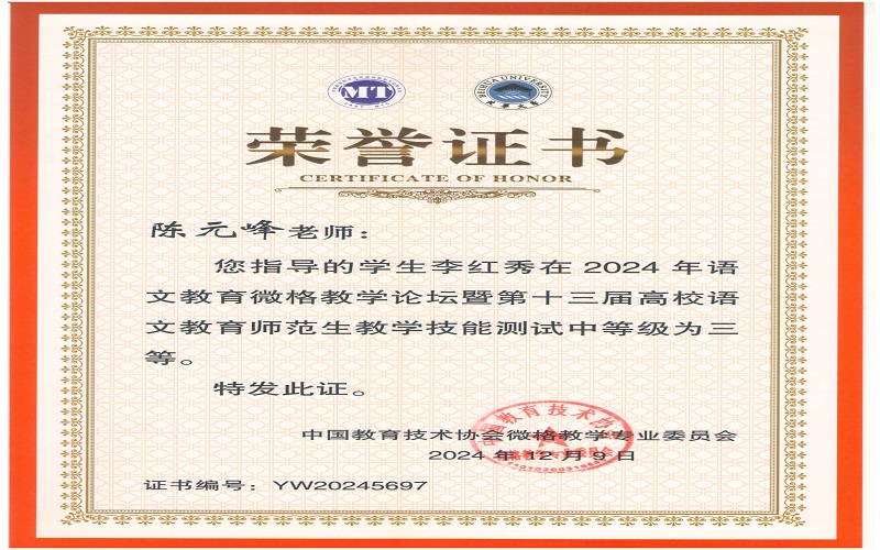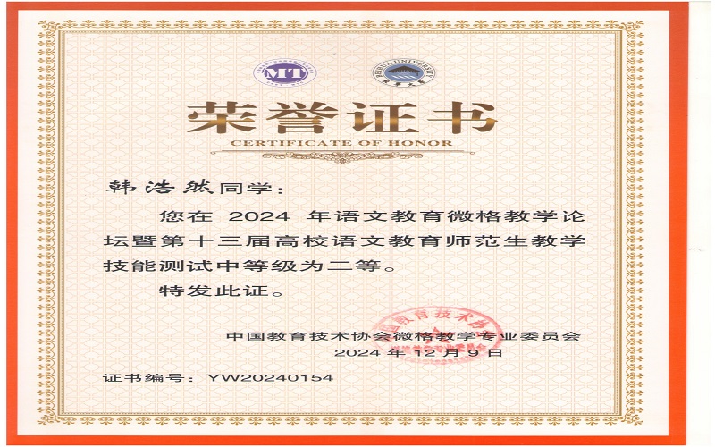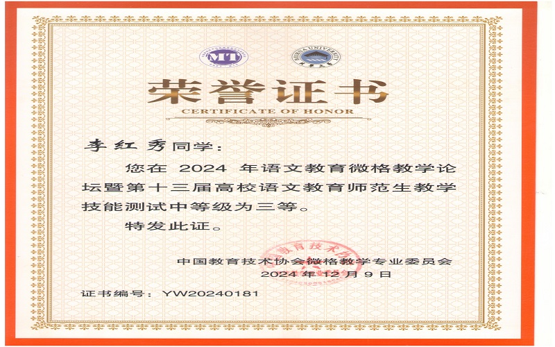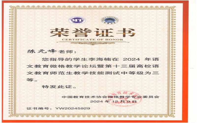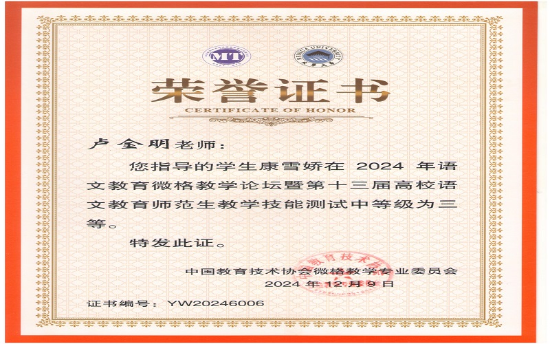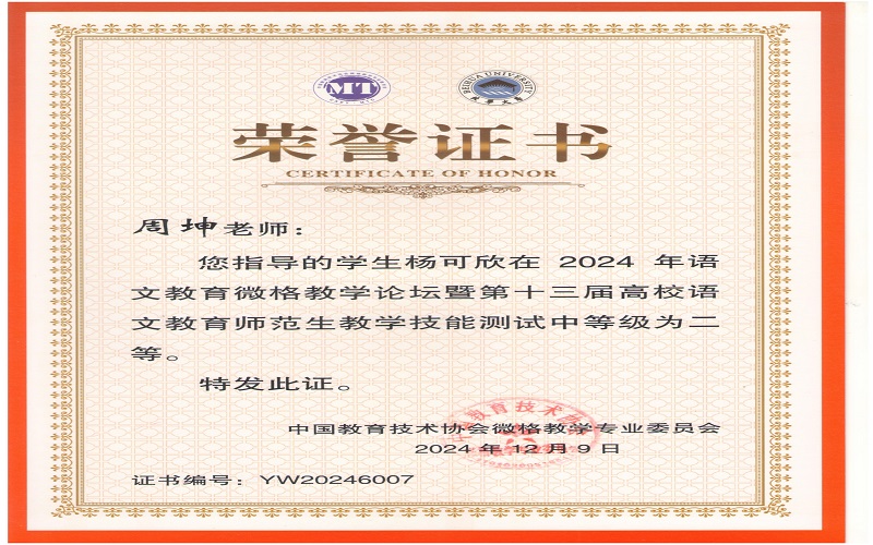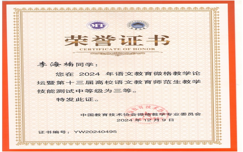 2024年12月7日,由中国教育技术协会微格教学专业委员会主办,北华大学承办的2024年语文微格教学论坛暨第十三届高校语文师范生教学技能测试与交流展示活动在吉林落下帷幕。来自全国九十多所高校500余名学生参与此次活动。文学与新闻传播学院杨可欣、曲航欣等6名同学参加了本次比赛并取得了好成绩。