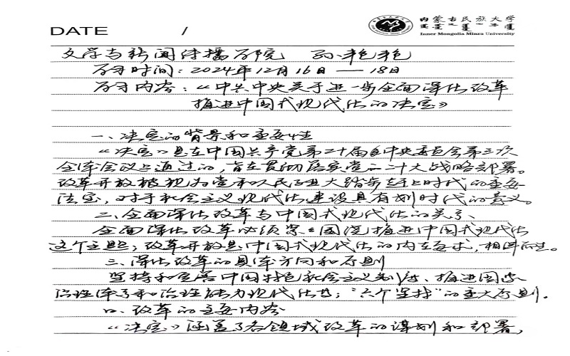 为进一步学习贯彻好党的二十届三中全会精神,根据学校党委下发的《内蒙古民族大学深入开展学习贯彻党的二十届三中全会精神教育培训实施方案》,结合学院工作实际,12月16日至18日,学院党委组织全院教师广泛开展对《中共中央关于进一步全面深化改革、推进中国式现代化的决定》的深度自学。在学习期间,各位教师坚持原原本本学习,坚持融会学、贯通学、系统学,把学习全会精神与推进学校学院各项事业高质量发展结合起来。