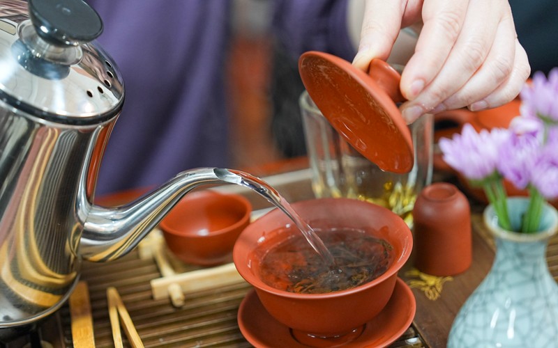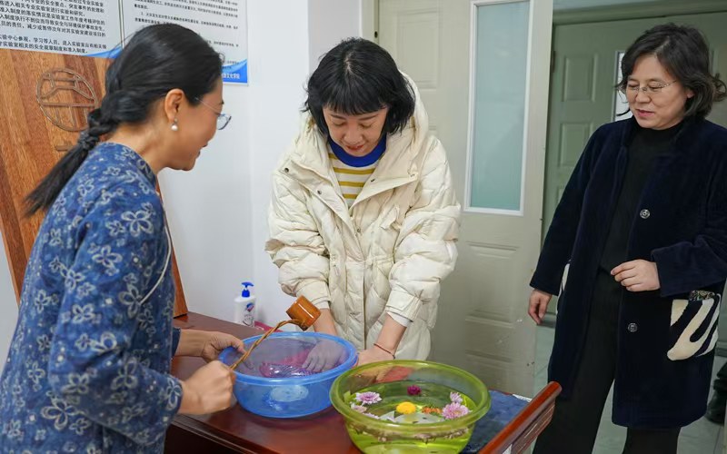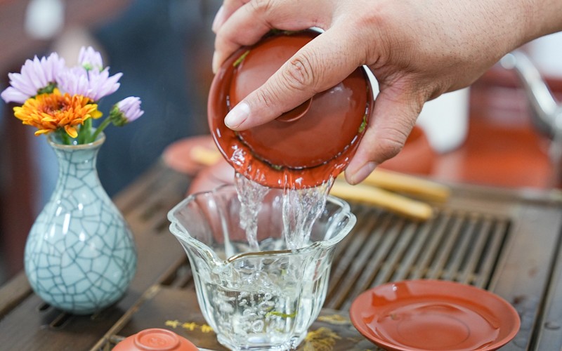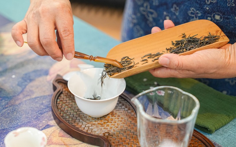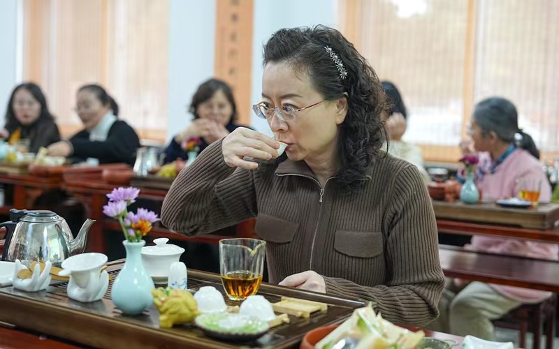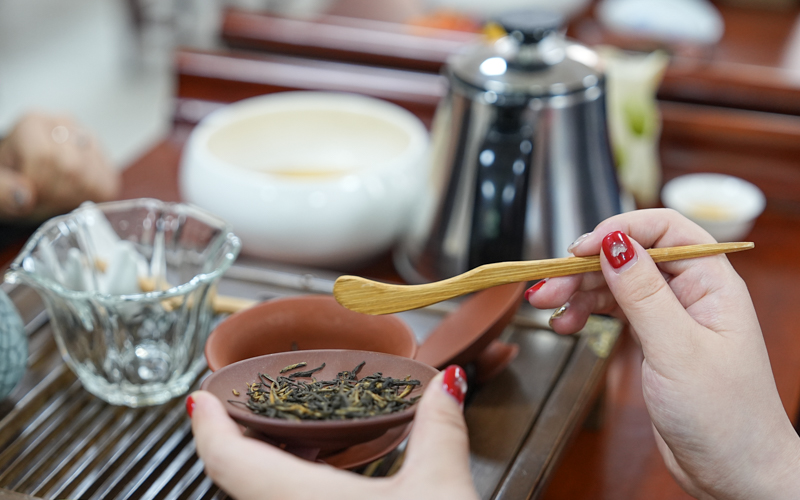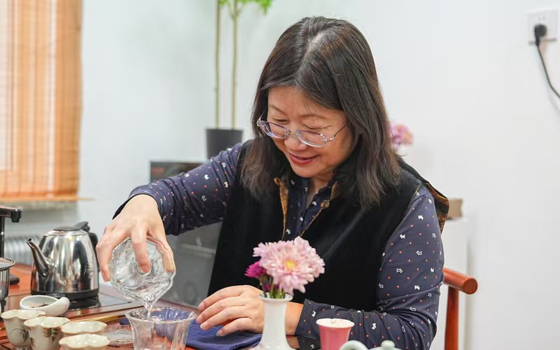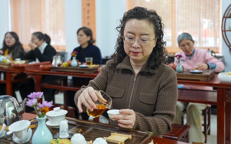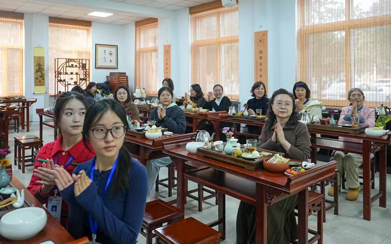 茶艺表演结束后,进入到了互动体验环节。师生们在茶艺师的指导下,纷纷动手尝试冲泡新茶。大家围坐在一起,认真学习冲泡茶的步骤和技巧,从温杯、置茶到注水、出汤,每一个动作都小心翼翼,生怕错过任何一个细节。