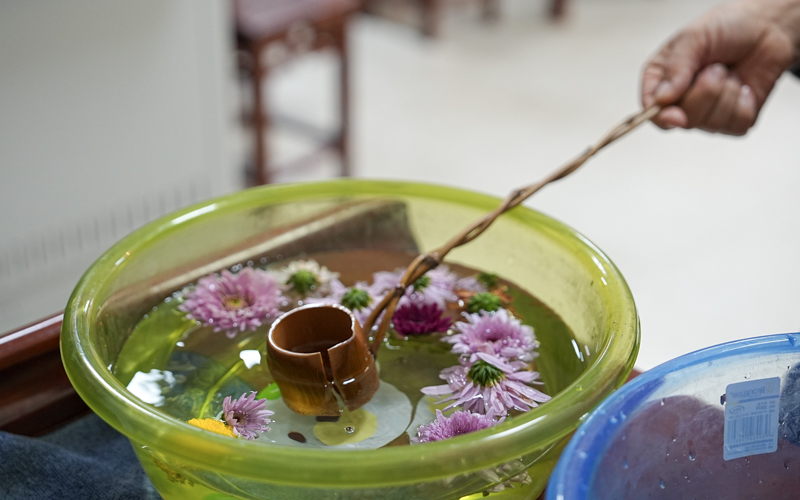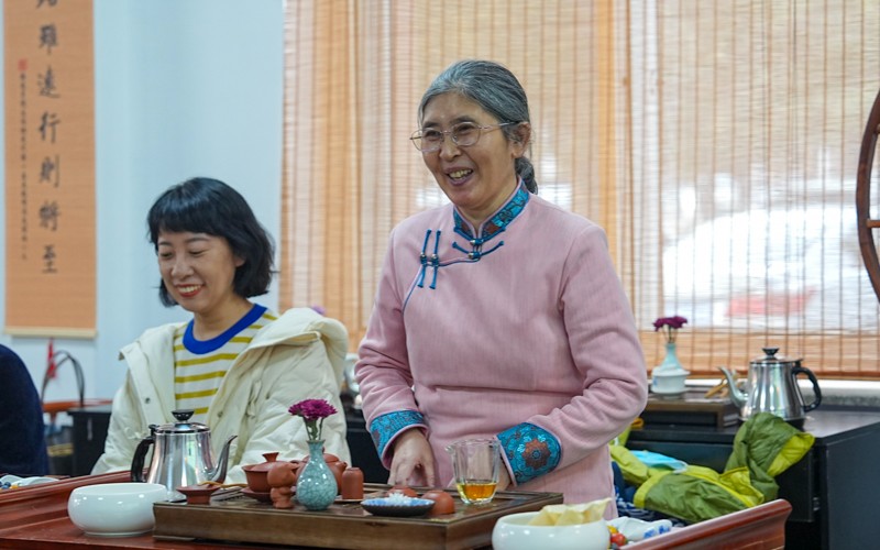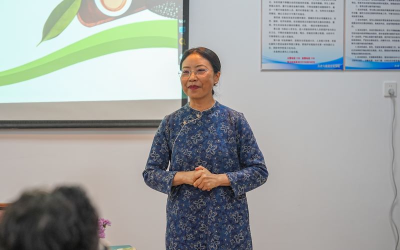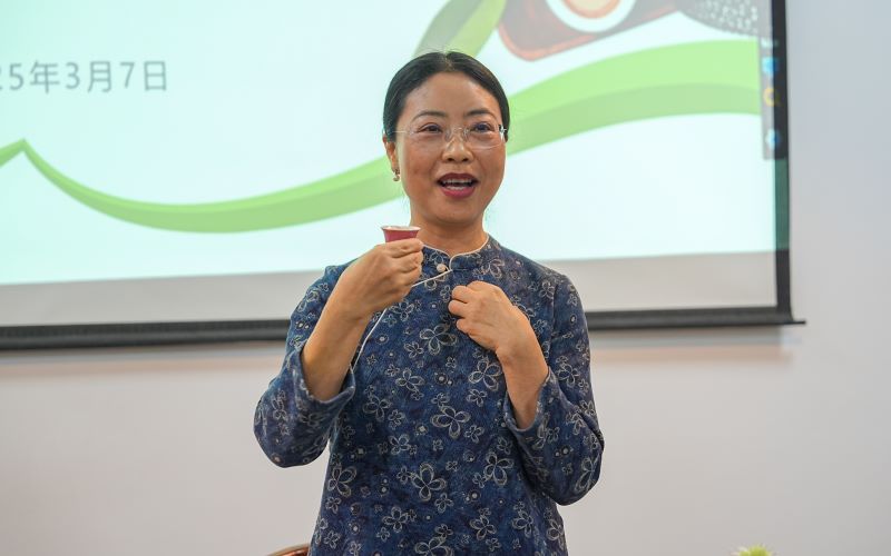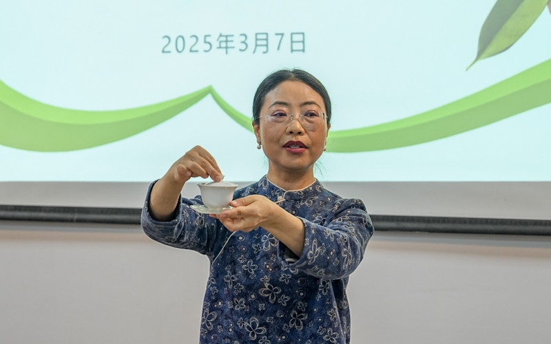 此次活动邀请了历史与旅游文化学院崔宁老师为大家主讲茶文化并进行茶艺展示。她首先介绍了中国茶文化的悠久历史和深厚底蕴,随后带给大家一场精彩的茶艺表演。崔老师身着典雅的汉服,动作轻柔优雅,从温盏、泡茶到品茶,每一个环节都做得如行云流水,充分展现出了茶艺的独特魅力。