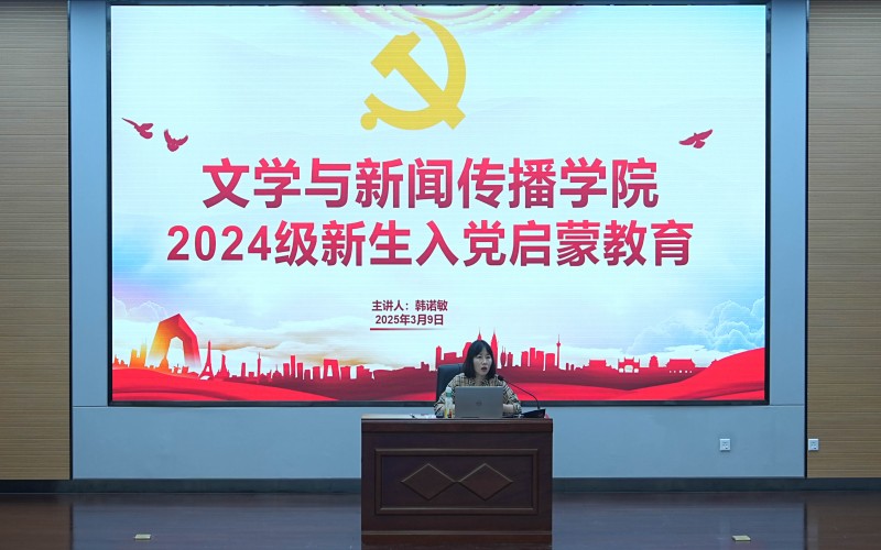 为进一步加强青年大学生的理想信念教育,提升全体2024级新生对党的认识,端正入党动机,熟悉入党流程,号召同学们积极向党组织靠拢,2025年3月9日晚,文学与新闻传播学院在图书馆大报告厅开展2024级新生入党启蒙教育,团总支书记韩诺敏担任主讲,共260余名2024级学生参加。
