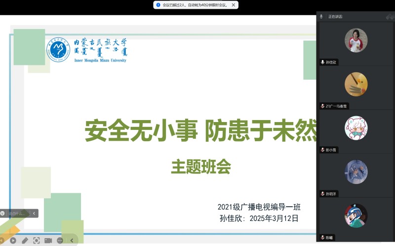 为贯彻落实学校关于《内蒙古民族大学第十五届安全教育活动月方案》的通知要求,2025年3月10日至14日文学与新闻传播学院各班级组织召开安全教育主题班会,覆盖1400余名学生。