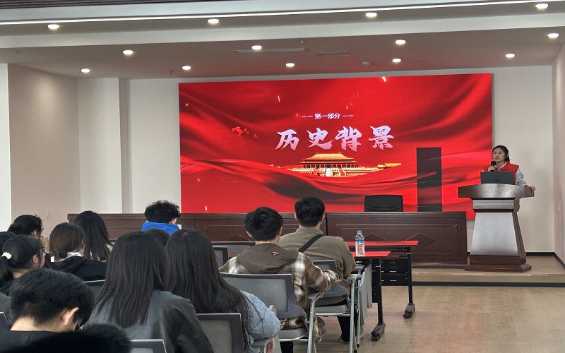 活动开篇,杨小扬以贵州特色景观图片为引,自然过渡到遵义会议这一核心主题。从九一八事变后国共两党截然不同的抗战态度,到第五次反围剿失败红军被迫长征,通道会议、黎平会议、猴场会议层层铺垫,再现了遵义会议前夕紧张危急的历史形势。宣讲人生动且深刻的语言,带领同学们感受当时会议的紧张形势,让同学们深刻领悟到“独立自主、团结统一”的遵义会议精神。