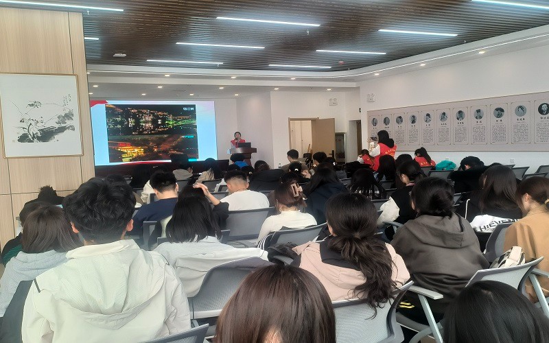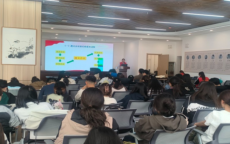 2025年3月21日,文学与新闻传播学院“红韵巨澜,遵道秉义”遵义会议精神志愿宣讲团在图书馆内蒙古诗歌研究中心开展“‘黔’进的力量——学史明理讲遵义,尽赏黔北山水韵”宣讲活动。此次活动由宣讲团成员杨小扬主讲,文学与新闻传播学院第二期青马班全体成员共计80余人参加。