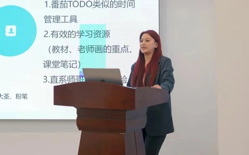 在经验分享会上,来自2021级汉语言文学三班的中共预备党员李红秀同学分享了按课程特点分配时间、运用工具提高效率等学习技巧。她还结合自己的学生干部经历,给同学们传授了利用碎片化时间学习、合理分配工作任务的方法,并阐述了减少焦虑的策略。最后,李红秀对在座的同学表达了诚挚的祝福,希望大家都能怀揣梦想,勇敢地探索未来,在属于自己的人生舞台上绽放光芒。