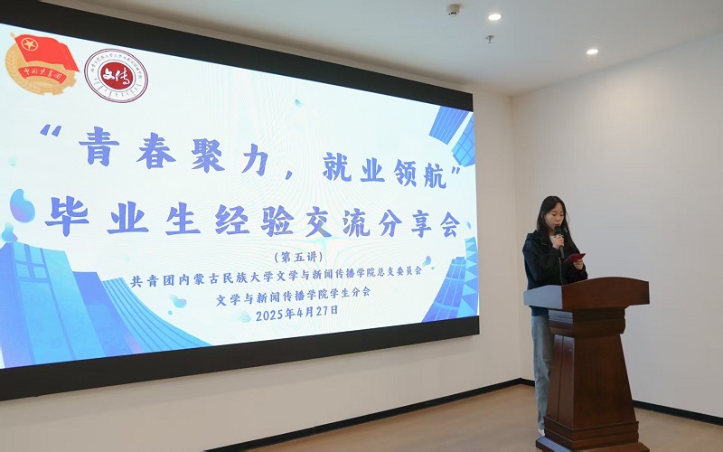 2025年4月27日晚,文学与新闻传播学院在图书馆内蒙古诗歌研究中心成功举办“青春聚力,就业领航”毕业生经验交流分享会(第五讲),活动共吸引100余名学生踊跃参与。