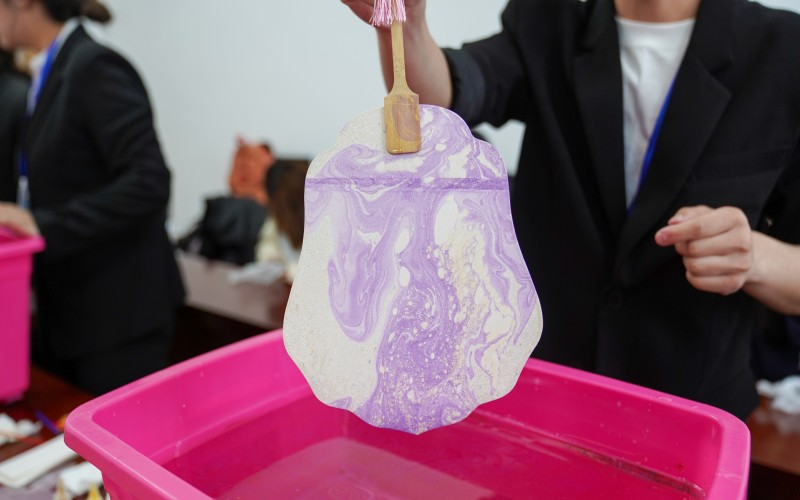 此次非遗手工沙龙活动通过漆扇水拓、螺钿镶嵌双主题创作,厚植劳动情怀,融合非遗技艺体验与劳动实践,展现“以劳育美、以艺润心”的育人理念,致敬工匠精神与劳动价值,为新时代劳动教育注入了文化厚度与创新活力。