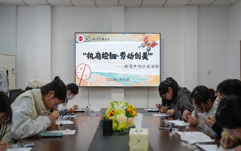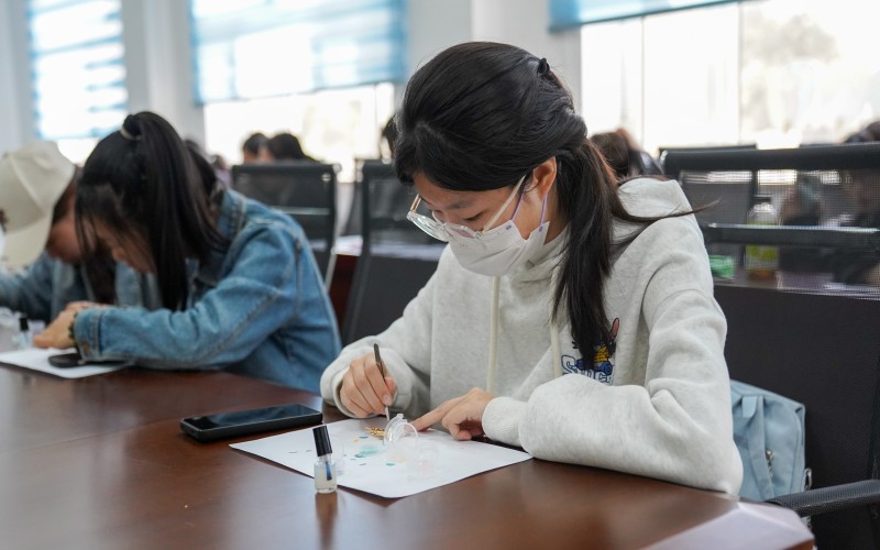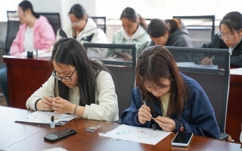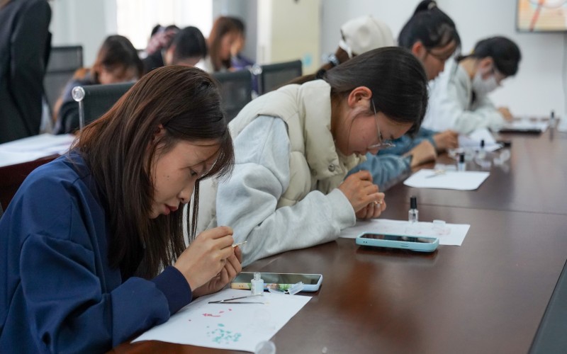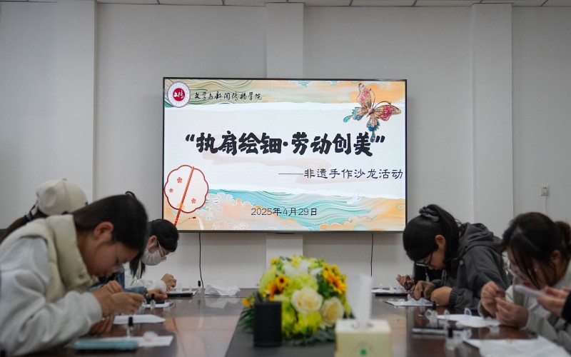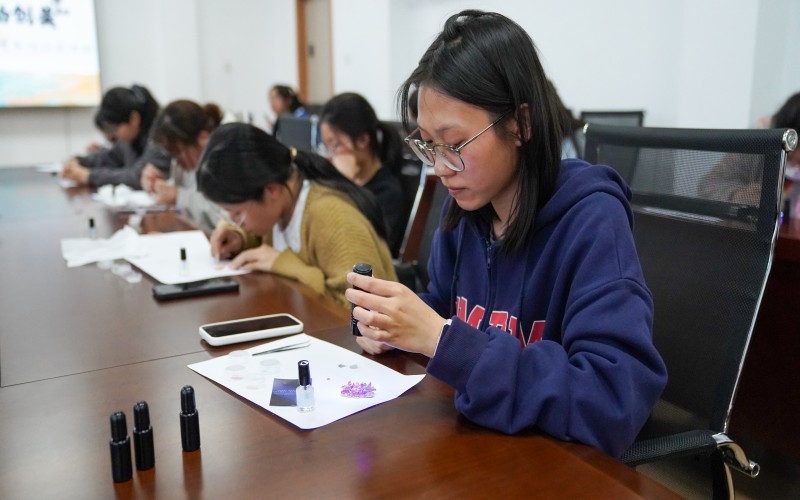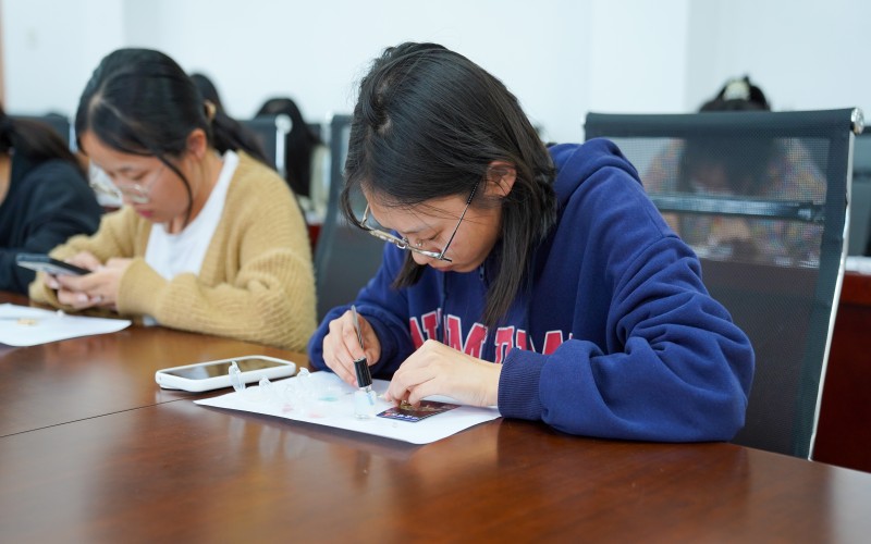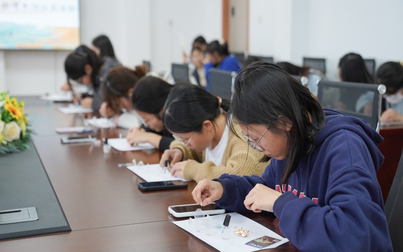 为迎接第135个“五一”国际劳动节,弘扬中华优秀传统文化与新时代劳动精神,4月29日中午,文学与新闻传播学院于霍林河校区思源楼204会议室举办“执扇绘钿·劳动创美”非遗手作沙龙活动。本次活动共40名同学参与。 活动中,工作人员详细介绍了漆扇与镙钿的制作步骤与技巧。参与制作漆扇的同学们通过调制漆液、水拓技法、扇面构图等实践,体验“漆色入水成画”的奇妙过程。漆液在水面流动晕染,最终拓印至素面团扇,形成独一无二的纹理。与此同时制作螺钿胸针的同学们通过挑选贝壳、设计纹样、镶嵌固定等工序,亲身体验“化朴为珍”的工艺智慧,制作的每一步都凝聚着匠心与巧思。这场手工沙龙活动不仅是一场非遗技艺的沉浸式体验,更是一堂生动的劳动教育课。通过亲手制作,大家都深刻地理解了“慢工出细活”的工匠精神,也感受到劳动创造价值的成就感。