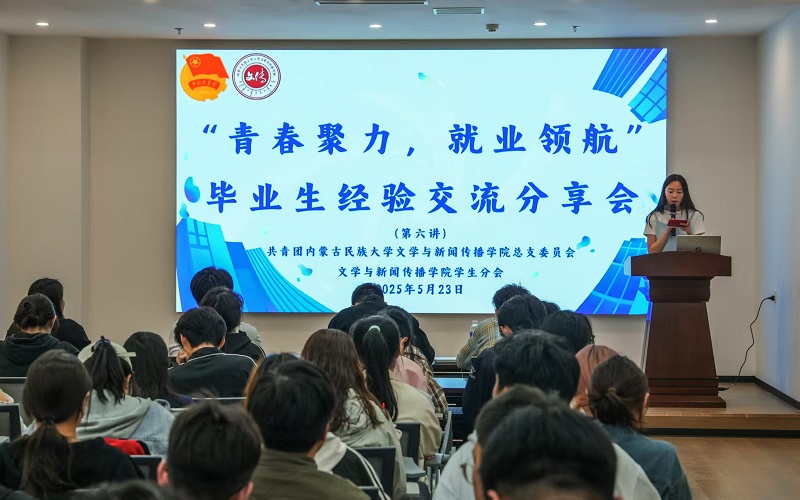 2025年5月23日晚,文学与新闻传播学院在图书馆内蒙古诗歌研究中心成功举办“青春聚力,就业领航”毕业生经验交流分享会(第六讲),100余名同学到场聆听。