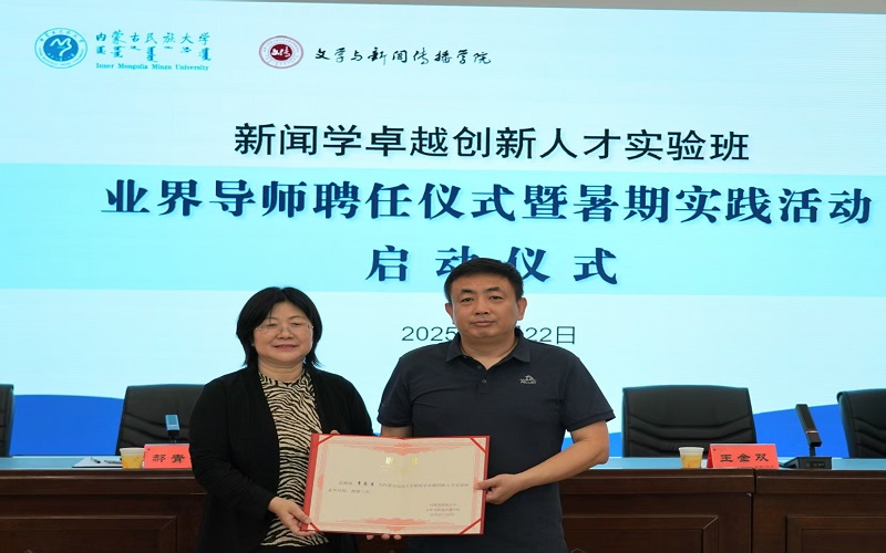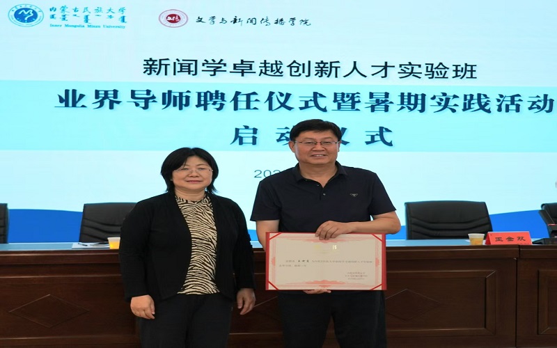 根据《新闻学卓越创新人才实验班实施细则》,聘请通辽市融媒体中心王世甫、李长生、张巍为实验班业界导师,聘期三年。郝青云在聘任仪式上宣读聘任决定并为业界导师颁发聘书。