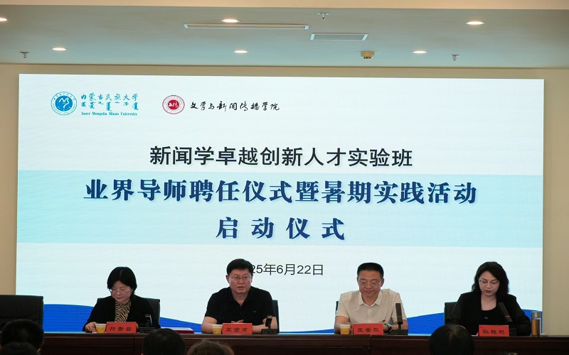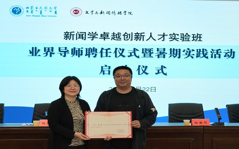 6月22日上午,文学与新闻传播学院新闻学卓越创新人才实验班业界导师聘任仪式暨暑期实践活动启动仪式在内蒙古诗歌研究中心举行。通辽市融媒体中心党委副书记王世甫,文学与新闻传播学院党委书记王金双,党委副书记、院长郝青云出席仪式。文学与新闻传播学院副院长孙艳艳主持此次活动。
