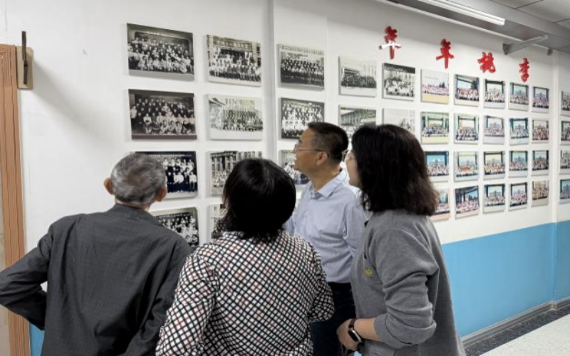 王金双、郝青云、孙艳艳陪同李老师在学院照片墙观看当年的毕业留影,回顾往昔岁月。李凤鸣毕业后曾任中学语文教师、政府秘书,之后回到母校中文系任教,回忆起在学校的岁月,他头脑清晰,如数家珍。