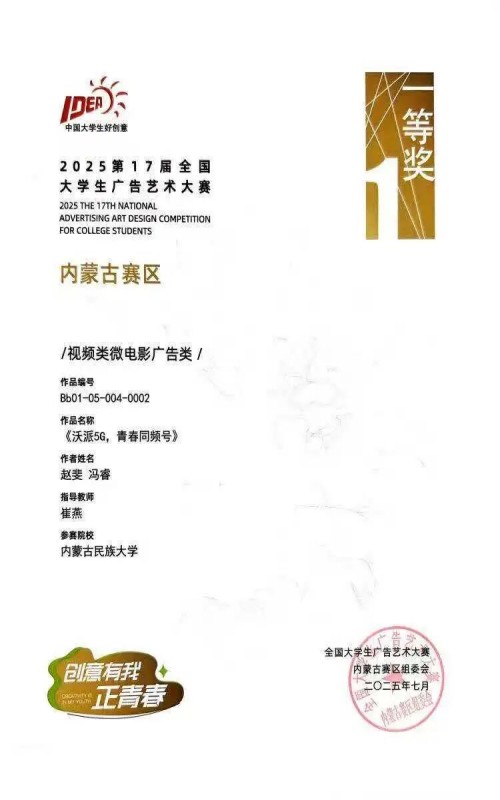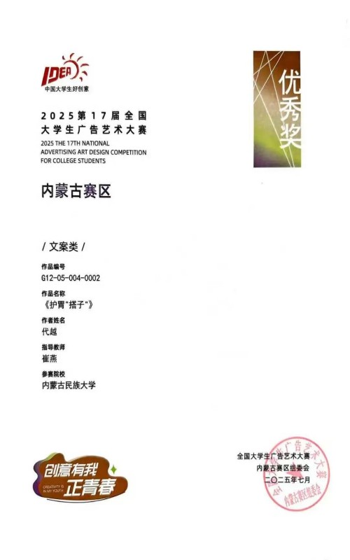 2023级广播电视编导二班赵斐与冯睿同学合作的作品《沃派5G,青春同频号》,凭借精准的主题把握和富有青春活力的创意表达,荣获内蒙古赛区一等奖。作品紧扣联通“沃派5G”的产品特性,传递出科技与青春同行的理念,赢得了评委的一致认可。2023级广播电视编导二班代越同学创作的《护胃“搭子”》从日常生活场景出发,以轻松有趣的创意聚焦饮食健康话题,有效传递品牌关怀,该作品荣获内蒙古赛区优秀奖。此外,代越与樊泽伟同学联合创作的《刮开青春盲盒,兑出公益惊喜》,巧妙结合“Z世代”喜爱的盲盒元素与公益传播主题,构思新颖、表现生动,同样获评内蒙古赛区优秀奖。